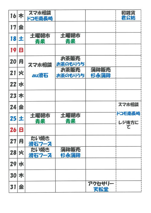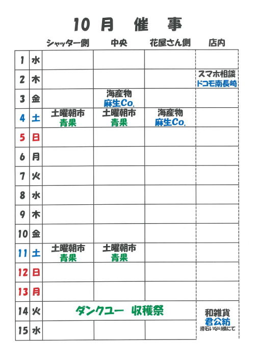 10月の店頭販売と店内催事の予定表です ※都合により変更になる場合があります